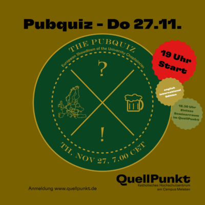 It’s that time again! On November 27 at 7:00 PM, we warmly invite you to the next PubQuiz hosted by KHG Flensburg – this time as the European Showdown of University Chaplaincies! Put your knowledge to the test, think together, and enjoy an evening full of fun, excitement, and team spirit.