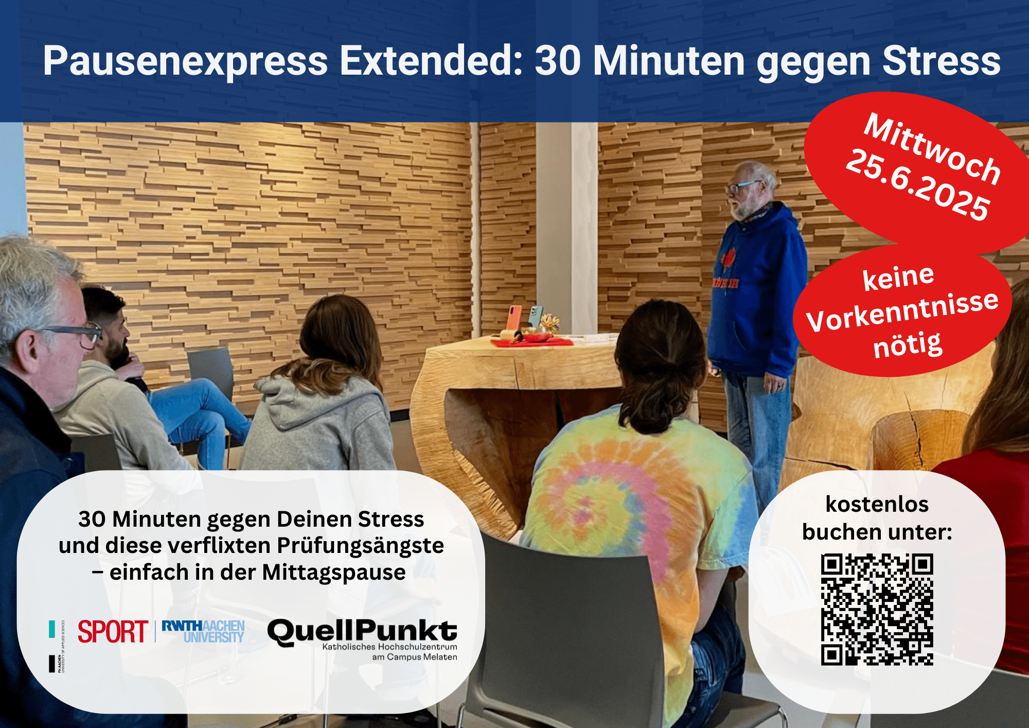 Am Mittwoch. 25.06.2025 bietet der Hochschulsport in unseren Räumen ein besonderes Angebot der Stressreduktion und Bewältigung von (Prüfungs-)ängsten anhand einer Klopftechnik an. In einer 30minütigen Einheit werden durch einen qualifizierten Referenten die wichtigsten Praktiken vermittelt – in der Mittagspause. Die Klopftechnik bietet Hilfe bei Stress, Prüfungsängsten aber auch bei allen anderen Ängsten oder unangenehmen Gedanken. Für Studierende und RWTH-MitarbeiterInnen ist das Angebot kostenlos – alle Externen zahlen einen Teilnehmerbeitrag von 6,00 €.